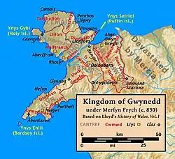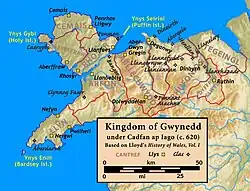 Welsh tradition credited the founding of Gwynedd to the Brittonic polity of Gododdin (Old Welsh Guotodin, earlier Brittonic form Votadini) from Lothian invading the lands of the Brittonic polities of the Deceangli, Ordovices, and Gangani in the 5th century.[17] The sons of their leader, Cunedda, were said to have possessed the land between the rivers Dee and Teifi.[18] The true borders of the realm varied over time, but Gwynedd proper was generally thought to comprise the cantrefs of Aberffraw, Cemais, and Cantref Rhosyr on Anglesey and Arllechwedd, Arfon, Dunoding, Dyffryn Clwyd, Llŷn, Rhos, Rhufoniog, and Tegeingl at the mountainous mainland region of Snowdonia opposite.[19]