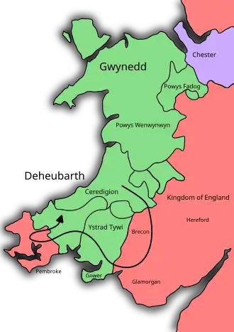 When Rhodri died in 878 AD (battle against Ceolwulf I of Mercia[79]) the relative unity of Wales ended and it was once again divided into its component parts each ruled by one of his sons. Rhodri's eldest son Anarawd ap Rhodri inherited Gwynedd and would firmly establish the princely House of Aberffraw. His son Merfyn ap Rhodri was given the Kingdom of Powys to rule and Cadell founded the medieval Welsh Royal House of Dinefwr in Deheubarth, this divided Wales into North Wales, Mid Wales and South Wales respectively. Gwynedd and the Aberffraw dynasty thrived with but a few interruptions until 1283.[88][89][90]