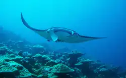 Kingman Reef supports a vast variety of marine life. Giant clams are abundant in the shallows, and there are approximately 38 genera and 130 species of stony corals on the reef. This is more than three times the species diversity of corals in the main Hawaiian Islands. The ecosystem of the reef and its subsequent food chain is known for the distinct quality of being primarily predator-based. Sharks comprised 74% of the top predator biomass (329 g·m−2) at Kingman Reef and 57% at Palmyra Atoll (97 g·m−2). Low shark numbers have been observed at Tabuaeran and Kiritimati.[25]