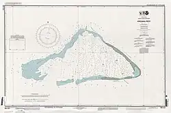 The reef encloses a lagoon up to 53 fathoms (318 ft; 97 m) deep in its eastern part near the northeastern spit of land.[4] The total area within the outer rim of the reef is 20 sq nmi (70 km2).[20] There are two small strips (spits) of dry land composed of coral rubble and giant clamshells on the eastern rim with areas of 2 and 1 acre (0.8 and 0.4 ha)[21][5] having a coastline of 2 miles (3 km), a short spit on the northeast side of the lagoon and a spit twice as long but thinner on its south side.[4]