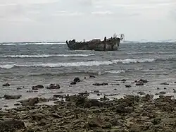 Kingman Reef was discovered on June 14, 1798, by the American captain Edmund Fanning of the ship Betsey. It was first described by Captain W. E. Kingman (whose name the island bears) of the ship Shooting Star on November 29, 1853. It was claimed in 1859 by the United States Guano Company, under the name "Dangers Rock," along with several other islands.[8] The claim was made under the U.S. Guano Islands Act of 1856, although there is no evidence that guano existed or was ever mined on Kingman Reef.[9][10] The British steamship Tarta struck the reef in June 1874, and it was later surveyed by HMS Penguin (1876) in 1897, establishing that Kingman Reef was the same hazard previously charted as Caldew Reef and Maria Shoal, among other names.[11]