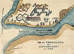 To establish a presence on Lake Ontario for the purpose of controlling the fur trade with local indigenous people, Louis de Buade de Frontenac, Governor of New France, established Fort Cataraqui, later to be called Fort Frontenac, at a location known as Cataraqui in 1673.[23] The fort served as a trading post and military base, and gradually attracted indigenous and European settlement. In 1674, René-Robert Cavelier, Sieur de La Salle was appointed commandant of the fort. From this base, de La Salle explored west and south as far as the Gulf of Mexico.[23] The fort was rebuilt several times and experienced periods of abandonment. The Iroquois siege of 1688 led to many deaths, after which the French destroyed the fort, but would rebuild it. The British destroyed the fort during the Battle of Fort Frontenac (Seven Years' War) in 1758 and its ruins remained abandoned until the British took possession and partially reconstructed it in 1783. The fort was renamed Tête-de-Pont Barracks in 1787. It was turned over to the Canadian military in 1870–71 and is still being used by the military. It was renamed Fort Frontenac in 1939.[24] Partially reconstructed parts of the original fort can be seen today at the western end of the La Salle Causeway.