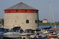 During the War of 1812, Kingston (with a population of 2,250)[33] was a major military centre. It was the base for the Lake Ontario division of the British naval fleet on the Great Lakes, which engaged in a vigorous arms race with the American fleet based at Sackets Harbor, New York for control of Lake Ontario. The Provincial Marine quickly placed ships into service and troops were brought in. A Royal Naval detachment built warships in order to control Lake Ontario.[23] Fortifications and other defensive structures were built. The first Fort Henry was built during this time to protect the dockyards in Navy Bay.[34] This fort was replaced by a more extensive fort on Point Henry in 1813.[35][23] The present limestone citadel, constructed between 1832 and 1836, was intended to defend the recently completed Rideau Canal (opened in 1832) at the Lake Ontario end as well as the harbour and the naval dockyard.[36] In 1843, the advanced battery overlooking the lake to the south was completed when the casemated commissariat stores and magazines were built. Fort Henry was garrisoned by British until 1871. It was restored starting in 1936 and is a popular tourist attraction, now part of a World Heritage Site.[34]
