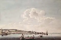 In 1783, Frederick Haldimand, governor of the Province of Quebec directed Major Samuel Holland, Surveyor-General of Quebec, to lay out a settlement for displaced British colonists, or Loyalists, who were fleeing north because of the American Revolutionary War and "minutely examine the situation and site of the Post formerly occupied by the French, and the land and country adjacent". Haldimand had originally considered the site as a possible location to settle loyal Mohawks.[25] The survey would also determine whether Cataraqui was suitable as a navy base since nearby Carleton Island on which a British navy base was located had been ceded to the Americans after the war. Holland's report about the old French post mentioned "every part surpassed the favorable idea I had formed of it", that it had "advantageous Situations" and that "the harbour is in every respect Good and most conveniently situated to command Lake Ontario".[25] Major John Ross, commanding officer of the King's Royal Regiment of New York at Oswego partly rebuilt Fort Frontenac in 1783. As commander, he played a significant role in establishing the Cataraqui settlement.
