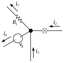 This law, also called Kirchhoff's first law, or Kirchhoff's junction rule, states that, for any node (junction) in an electrical circuit, the sum of currents flowing into that node is equal to the sum of currents flowing out of that node; or equivalently: