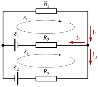 According to the first law: Applying the second law to the closed circuit s1, and substituting for voltage using Ohm's law gives: The second law, again combined with Ohm's law, applied to the closed circuit s2 gives:
