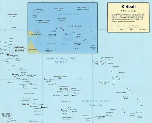 The Gilbert Islands gained independence as the Republic of Kiribati on 12 July 1979.[83] Then, in September, the United States relinquished all claims to the sparsely inhabited Phoenix and Line Islands, in a 1979 treaty of friendship with Kiribati (ratified in 1983).[84] Although the indigenous Gilbertese name for the Gilbert Islands proper is "Tungaru", the new state chose the name "Kiribati", the Gilbertese spelling of "Gilberts", because it was more modern and as an equivalent of the former colony to acknowledge the inclusion of Banaba, the Line Islands, and the Phoenix Islands. The last two archipelagoes were never initially occupied by Gilbertese until the British authorities, and later the republic's government, resettled Gilbertese there under resettlement schemes.[42][85] In 1982, the first elections since independence were held. A no-confidence vote provoked another election in 1983. In the post-independence period, overcrowding has been an issue, at least in British and aid organisations' eyes. In 1988, an announcement was made that 4,700 residents of the main island group would be resettled onto less populated islands. In September 1994, Teburoro Tito from the opposition was elected president.[86]