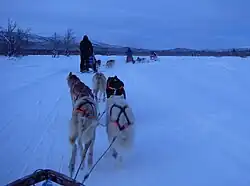 Although some tourists had already started coming to the area in the 19th century, the completion of the railway line truly made tourism possible. Tourists came for the rivers and the mountains, but also geologists and entire classes of students came to see the mine. Additionally, a yearly winter sports festival was started, which attracted people from a wide area. The Sami population was already a tourist attraction in the early days of Kiruna's existence.[18]