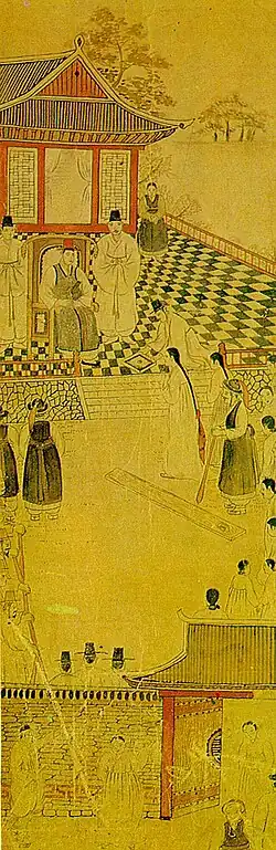 The women trained in the gyobang were exclusively court entertainers. Their role in the affairs of the court became increasingly important as the dynasty progressed. They entertained both the king and visiting dignitaries, a role which continued into the Joseon period. In addition, beginning in the reign of Munjong, they performed at official ceremonies of the state.[52]