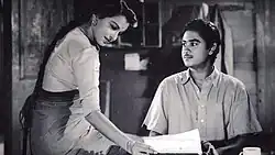 Kumar starred in Bimal Roy's Naukari (1954) and Hrishikesh Mukherjee's directorial debut Musafir (1957). Salil Chowdhury, the music director for Naukari, was initially dismissive of Kumar as a singer when he found that Kumar had no formal training in music.[45] However, after hearing his voice, Chowdhury gave him the song Chhota Sa Ghar Hoga, which was supposed to be sung by Hemant Kumar.[49] The commercially successful films of Kumar included Ladki (1953), Naukari (1954), Baap Re Baap (1955), Paisa Hi Paisa (1956), New Delhi (1956), Naya Andaz (1956), Bhagam Bhaag (1956), Bhai Bhai (1956), Aasha (1957), Chalti Ka Naam Gaadi (1958), Dilli Ka Thug (1958), Jaalsaaz (1959), Bombay Ka Chor (1962), Chacha Zindabad (1959), Man-Mauji (1962), Jhumroo (1961), Half Ticket (1962), Mr. X in Bombay (1964), Shreeman Funtoosh (1965), Ek Raaz (1963), Ganga Ki Lahren (1964), Hum Sab Ustaad Hai (1965), Haal E Dil, Pyar Kiye Jaa (1966), and Padosan (1968). As an actor, his best period was between 1954 and 1966. His onscreen pairing with actresses Mala Sinha, Vyjayanthimala, Nutan, Madhubala, Meena Kumari and Kumkum gave the biggest hits in his career.[50]