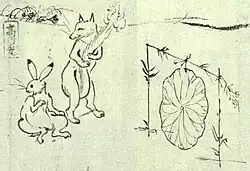 The kitsune was purportedly capable of firing off the kitsunebi ("fox fire") flame from their tail by stroking it, as portrayed in the Chōjū-jinbutsu-giga (fig. right),[139] or by striking the tail against the ground.[140][141] Or it might have been the kitsune's fiery breath, according to regional tradition.[142][141]