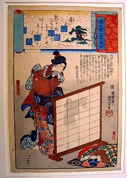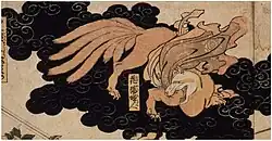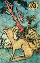 The story was later introduced or invented (established by the 14th century), that the queen-consort Daji (Japanese pronunciation: Dakki) was really a nine-tailed fox that led to the destruction of Yin/Shang dynasty,[i] and the same vixen some 2,000 years later appeared as Tamamo-no-mae in Japan (q.v., also § Tamamo-no-mae and Hokusai's painting of Tamamo previously as Lady Kayō of India). Tamamo clearly draws from Chinese myth and literature,[66][67][68] so her being depicted as a golden-furred and kyūbi no kitsune (九尾の狐; 'nine-tailed fox')[69] matches precisely what the Chinese classics writes about the celestial fox (tian hu 天狐) which a 1,000 year old fox turns into.[70]