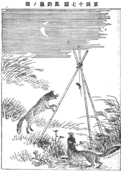 The fox in fable is also famed for tricking humans into eating dumpling (dango) actually made of horse dung.[119] This is alluded to in the novel Tōkaidōchū Hizakurige (1822) colloquially known as Yaji-Kita after the characters making the journey. In one scene, Yajirobē who "imagines that the fox has taken the shape of [Kitahachi]" refuses the mochi offered him on suspicion of it being inedible horse dung.[11] Foxes are also accused of tricking people into taking a bath in a night soil pot (human manure pit)[120] or a "cesspool" as Hearn puts it politely.[121]