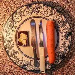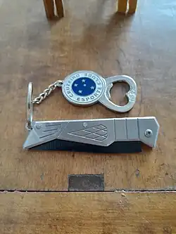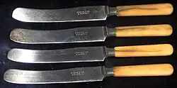 In Greece, a black-handled knife placed under the pillow is used to keep away nightmares.[30] As early as 1646 reference is made to a superstition of laying a knife across another piece of cutlery being a sign of witchcraft.[31] A common belief is that if a knife is given as a gift, the relationship of the giver and recipient will be severed. Something such as a small coin, dove or a valuable item is exchanged for the gift, rendering "payment."[32]