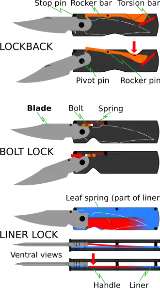 - Lockback – Also known as the spine lock, the lockback includes a pivoted latch affixed to a spring, and can be disengaged only by pressing the latch down to release the blade.