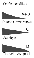 Knives are sharpened in various ways. Flat ground blades have a profile that tapers from the thick spine to the sharp edge in a straight or convex line. Seen in cross section, the blade would form a long, thin triangle, or where the taper does not extend to the back of the blade, a long thin rectangle with one peaked side. Hollow ground blades have concave, beveled edges. The resulting blade has a thinner edge, so it may have better cutting ability for shallow cuts, but it is lighter and less durable than flat ground blades and will tend to bind in deep cuts.[7] Serrated blade knives have a wavy, scalloped or saw-like blade. Serrated blades are more well suited for tasks that require aggressive 'sawing' motions, whereas plain edge blades are better suited for tasks that require push-through cuts (e.g., shaving, chopping, slicing).