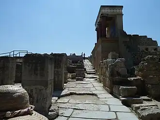 Knossos (/(kə)ˈnɒsoʊs, -səs/; Ancient Greek: Κνωσσός, romanized: Knōssós, pronounced [knɔː.sós]; Linear B: 𐀒𐀜𐀰 Ko-no-so[2]) is a Bronze Age archaeological site in Crete. The site was a major centre of the Minoan civilization and is known for its association with the Greek myth of Theseus and the minotaur. It is located on the outskirts of Heraklion, and remains a popular tourist destination. Knossos is considered by many to be the oldest city in Europe.[3]