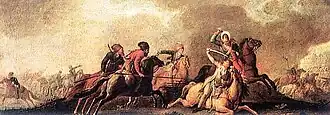Suvorov's troops grew angry due to resistance and also due to tales of atrocities committed against Russian troops in the spring, leading to Suvorov's army to commit to an assault.[50] On 4 November, the joint Russian forces started the Battle of Praga, after the name of the right-bank suburb of Warsaw where it took place. After four hours of brutal hand-to-hand fighting, the 22,000-strong Russian forces broke through the Polish defences and Suvorov allowed his Cossacks to loot and burn Warsaw.[3]: 210  By one Russian estimate, approximately 20,000 were murdered in the Praga massacre;[3]: 211  the number includes both military personnel and civilians.[51] Zajaczek fled wounded, abandoning the Polish army.[3]: 195
