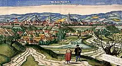 The first written mention of the city was in 1230 as "Villa Cassa".[7] The name probably comes from the Slavic personal name Koš, Koša → Košici (Koš'people) → Košice (1382–1383) with the patronymic Slavic suffix "-ice" through a natural development in Slovak (similar place names are also known from other Slavic countries).[8][9] In Hungarian Koša → Kasa, Kassa with a vowel mutation typical for the borrowing of old Slavic names in the region (Vojkovce → Vajkócz, Sokoľ → Szakalya, Szakál, Hodkovce → Hatkóc, etc.).[10] The Latinized form Cassovia became common in the 15th century.[9]