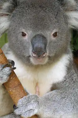 The koala has a broad, dark nose[35] with a good sense of smell, and it is known to sniff the oils of individual branchlets to assess their edibility.[10]: 81  Its relatively small eyes are unusual among marsupials in that the pupils have vertical slits,[31] an adaptation to living on a more vertical plane. Its round ears provide it with good hearing,[35][22]: 6  and it has a well-developed middle ear.[14] The koala larynx is located relatively low in the vocal tract and can be pulled further down. They possess unique folds in the velum (soft palate), known as velar vocal folds, in addition to the typical vocal folds of the larynx. These features allow the koala to produce deeper sounds than would otherwise be possible for their size.[36][37]