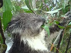 Koalas are herbivorous, and while most of their diet consists of eucalypt leaves, they can be found in trees of other genera, such as Acacia, Allocasuarina, Callitris, Leptospermum, and Melaleuca.[10]: 73  Though the foliage of over 600 species of Eucalyptus is available, the koala shows a strong preference for around 30.[44] They prefer plant matter with higher protein than fibre and lignin.[17]: 231  The most favoured species are Eucalyptus microcorys, E. tereticornis, and E. camaldulensis, which, on average, make up more than 20% of their diet.[45] Despite its reputation as a picky eater, the koala is more generalist than some other marsupial species, such as the greater glider. The koala does not need to drink often as it can get enough water from the leaves,[10]: 73–74  though larger males may additionally drink water found on the ground or in tree hollows.[17]: 231  When feeding, a koala reaches out to grab leaves with one forepaw while the other paws hang on to the branch. Depending on the size of the individual, a koala can walk to the end of a branch or must stay near the base.[10]: 96  Each day, koalas eat up to 400 grams (14 oz) of leaves, spread over four to six feeding periods.[2]: 187  Despite their adaptations to a low-energy lifestyle, they have meagre fat reserves.[2]: 189