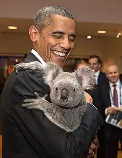 The koala is classified with wombats (family Vombatidae) and several extinct families (including marsupial tapirs, marsupial lions and giant wombats) in the suborder Vombatiformes within the order Diprotodontia.[11] The Vombatiformes are a sister group to a clade that includes macropods (kangaroos and wallabies) and possums.[12] The koala's lineage possibly branched off around 40 million years ago during the Eocene.[13]