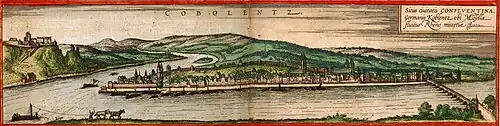 In 1249–1254, Koblenz was given new walls by Archbishop Arnold II of Isenburg; and it was partly to overawe the turbulent citizens that successive archbishops built and strengthened the fortress of Ehrenbreitstein that still dominates the city.[3]