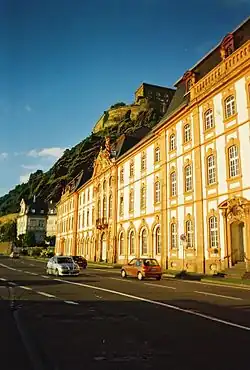 In 1688, Koblenz was besieged by the French under Marshal de Boufflers, but they only succeeded in bombing the Old City (Altstadt) into ruins, destroying among other buildings the Old Merchants' Hall (Kaufhaus), which was restored in its present form in 1725.[12] The city was the residence of the archbishop-electors of Trier from 1690 to 1801.