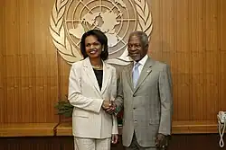 Annan supported sending a UN peacekeeping mission to Darfur, Sudan.[77] He worked with the government of Sudan to accept a transfer of power from the African Union peacekeeping mission to a UN one.[78] Annan also worked with several Arab and Muslim countries on women's rights and other topics.[79]