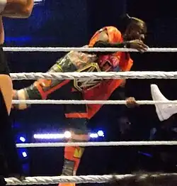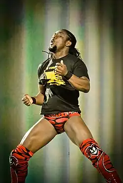 On the October 19, 2009 episode of Raw, Kingston spoke without a Jamaican accent during a televised segment, dropped the Jamaican character and began being billed from his home country of Ghana.[53][54] At Bragging Rights, Kingston wrestled as part of the Team Raw, which lost the match after Raw teammate Big Show betrayed them by chokeslamming Kingston, allowing Chris Jericho to pin Kingston to pick up the win for Team SmackDown.[55] After Kingston interfered in a match between Randy Orton and John Cena for Cena's WWE Championship match,[56] Orton and Kingston feuded, including a 5-men Survivor Series team against each other where Kingston's team won after he was the sole survivor, last eliminating Orton.[57] and TLC: Tables, Ladders & Chairs,[58] where Orton defeated Kingston.[59] They also participated in a triple threat match which included John Cena to determined a challenger for the WWE Championship at the Royal Rumble, which was won by Orton, who pinned Kingston.[60] Around a week earlier, on the January 4, 2010 episode of Raw, Kingston botched the finish of a match with Orton, and kept getting up despite the plan having been to take a punt kick on the ground from Orton. Orton was reportedly insulted by this, delivered a stiff RKO, and Kingston reportedly had a push stopped following complaints from Orton. He would remain a mid-carder for the next decade.[61][62][63][64] He competed in the Elimination Chamber match for the WWE Championship at Elimination Chamber, but was eliminated by the champion Sheamus. At WrestleMania XXVI, Kingston was unsuccessful in the Money in the Bank match, which was won by Jack Swagger.