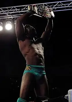 On June 25, 2008, Kingston was drafted to the Raw brand, as part of the WWE Supplemental Draft.[36] In his first match as a member of Raw roster, and first championship match in WWE, he defeated Chris Jericho for the Intercontinental Championship at Night of Champions, after Shawn Michaels, whom Jericho was feuding with, attacked Jericho's manager Lance Cade.[37] The win made him the first African-born wrestler to hold a championship in World Wrestling Entertainment.[38] Kingston held the championship until SummerSlam, where he and Women's Champion Mickie James both lost their championships in an intergender "winner take all" tag team match to Santino Marella and Beth Phoenix.[39]