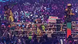At the Royal Rumble on January 28, 2018, Kingston entered the match as the 16th entrant, but was eliminated by Andrade "Cien" Almas. At Fastlane, The New Day faced The Usos for the Smackdown Tag Team Championships, but went to a no contest after interference from The Bludgeon Brothers.[142] Two weeks later, it was confirmed that at WrestleMania 34, The New Day would face The Usos and The Bludgeon Brothers in a Triple Threat tag team match for the Smackdown Tag Team Championships.[143] The New Day failed to capture the titles at the WrestleMania, which were won by The Bludgeon Brothers. On the April 11 episode of SmackDown Live, The New Day were defeated by The Usos in a match to determine which team would challenge The Bludgeon Brothers at the Greatest Royal Rumble event. The New Day competed in a tag team tournament, defeating Sanity in the first round, while The Bar (Cesaro and Sheamus) defeated The Usos. The New Day then defeated The Bar the following week on SmackDown Live to earn the right to face The Bludgeon Brothers at SummerSlam, where they won the match by disqualification, meaning The Bludgeon Brothers retained their titles. Two days later on SmackDown Live, however, The New Day defeated The Bludgeon Brothers in a no disqualification match to capture the titles for a third time.[144] At Hell in a Cell, The New Day successfully defeated Rusev and Aiden English to retain the titles.[145] A few weeks later on October 6, at Super Show-Down, The New Day again retained their titles by defeating The Bar.[146] At SmackDown 1000, The New Day lost their titles against The Bar.[147] They would fail to regain the titles at Crown Jewel event.[148]