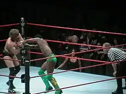 A series of vignettes for Kingston's television debut began airing on the weekly ECW on Syfy television show starting on December 6, 2007.[29] During this introduction phase, his videos, the official website and commentators noted he would be the first Jamaican to wrestle for WWE, but he does not have any Jamaican ancestry, nor any connection to Jamaica.[a][19][31] He is, however, the first African-born performer in WWE history. He debuted on the January 22, 2008 ECW as a face with a win over local wrestler David Owen in Charlottesville, Virginia.[32] After wrestling sporadic matches, Kingston was involved in his first major match, a 24-man battle royal during the WrestleMania XXIV pre-show with the winner receiving an ECW Championship match, but was eliminated by Mark Henry.[33] Kingston remained undefeated in singles competition in ECW for months and was placed into a feud with Shelton Benjamin at the end of April 2008. After two straight losses, Benjamin got a win over Kingston on the May 20 ECW, ending his undefeated streak.[34] On the June 24 ECW, Kingston defeated Benjamin in an Extreme Rules match to end their feud.[35]