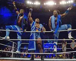 In November, WWE began airing vignettes for Kingston, Woods and Big E, with the stable now being billed as The New Day, and presented as overly-positive-minded babyfaces.[125][126] They made their in-ring debut as a stable on the November 28 episode of SmackDown in a winning effort against Curtis Axel, Heath Slater and Titus O'Neil.[127] They started a brief feud with Gold and Stardust, which Kingston and Big E defeated Gold and Stardust at the TLC: Tables, Ladders & Chairs pre-show on December 14.[128] At the WrestleMania 31 pre-show on March 29, 2015, they failed to win the WWE Tag Team Championship in a fatal four-way match as well as being eliminated by Big Show in the Andre the Giant Memorial Battle Royal.