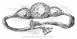 The much lighter but more dazzling stone was mounted in a honeysuckle brooch and a circlet worn by the queen.[8] At this time, it belonged to her personally, and was not yet part of the Crown Jewels.[27] Although Victoria wore it often, she became uneasy about the way in which the diamond had been acquired. In a letter to her eldest daughter, Victoria, Princess Royal, she wrote in the 1870s: "No one feels more strongly than I do about India or how much I opposed our taking those countries and I think no more will be taken, for it is very wrong and no advantage to us. You know also how I dislike wearing the Koh-i-Noor".[64]