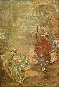 A descendant of Susanoo, Ōnamuji-no-Kami (大穴牟遅神), helps a hapless hare that had been mistreated by his eighty brothers (八十神, yasogami); the hare, in turn, helps Ōnamuji win the hand of the goddess Yagamihime (八上比売) of Inaba. This earns Ōnamuji the jealousy of his brothers, who begin to make repeated attempts on his life. Seeking refuge in a subterranean realm ruled by Susanoo called Ne-no-Katasukuni (根之堅洲国), Ōnamuji meets and falls in love with Susanoo's daughter Suseribime-no-Mikoto (須勢理毘売). Upon learning of their affair, Susanoo imposes four trials on Ōnamuji, each of which he overcame with Suseribime's help. Ōnamuji manages to outwit Susanoo and leave the realm, taking his new wife Suseribime as well as Susanoo's sword, koto, and bow and arrows back with him, but not before being advised by Susanoo to change his name to Ōkuninushi-no-Kami (大国主神, "Master of the Great Land"). Ōkuninushi defeats his wicked brothers and becomes the lord of Ashihara-no-Nakatsukuni. Under the name Yachihoko-no-Kami (八千矛神, "Eight Thousand Spears"), he takes a third wife, Nunakawahime (沼河比売) of Koshi.