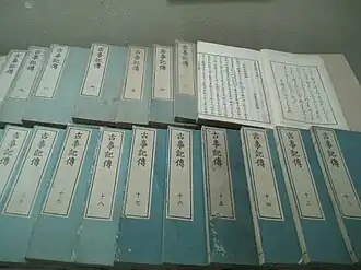 The Kojiki received its most serious study and exposition in the hands of Motoori Norinaga, who obtained a copy of the Kan'ei printed edition in 1754. After meeting Mabuchi in 1763, Norinaga began to devote his efforts to an in-depth scholarly study of the text. A monumental 44-volume study of the Kojiki called Kojiki-den, composed over a 34-year period (1764–1798), was the fruit of his labor.[16] With Norinaga, the Kojiki assumed an importance equal to the Nihon Shoki; in fact, in his view the Kojiki was a more trustworthy source for ancient Japanese traditions than was the Shoki precisely because it was free of "Chinese mentality". He viewed the Kojiki as a true account of actual events that when read correctly, could reveal Japan in its pristine, ideal state as a community where the kami, the emperor and the people lived in harmony.[16][19] Norinaga's work was carried on in different directions by his disciple Hirata Atsutane and his rivals Fujitani Mitsue (1768–1823)[20] and Tachibana Moribe (1781–1849),[21] who each produced commentaries and treatises on the text.[16]