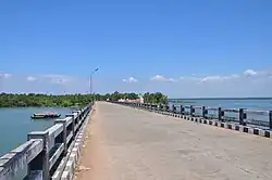 Kollam city is bordered by the panchayats of Neendakara and Thrikkaruva to the north, Mayyanad to the south, and Thrikkovilvattom and Kottamkara to the east, and by the Laccadive Sea to the west. Ashtamudi Lake is in the heart of the city. The city is about 71 km (44 mi) away from Thiruvananthapuram, 140 km (87 mi) away from Kochi and 350 km (220 mi) away from Kozhikode. The National Waterway 3 and Ithikkara river are two important waterways passing through the city. The 7.7 km (4.8 mi) long Kollam Canal is connecting Paravur Lake ans Ashtamudi Lake. The Kallada river, another river that flows through the suburbs of the city, empties into Ashtamudi Lake, while the Ithikkara river runs to Paravur Kayal. Kattakayal, a freshwater lake in the city, connects another water-body named Vattakkayal with Lake Ashtamudi.[71][72][73] In March 2016, IndiaTimes selected Kollam as one of the nine least polluted cities on earth to which anybody can relocate.[74] Kollam is one among the top 10 most welcoming places in India for the year 2020, according to Booking.com's traveller review awards.[75]