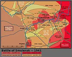 By 25 July, Guderian had been able to free his considerable tank forces from defensive duties, and mobilized the 17th Panzer Division for a concerted effort to advance north and clear Rokossovsky from his tenuous position, but the 17th Panzer was still unable to reach the Dnepr and finally close the pocket.[42] Nonetheless, under attack from north and south Rokossovsky was unable to prevent Hoth's 20th Motorized Infantry from capturing bridgeheads over the Dnepr on the 27th, sealing the pocket.[42] The encircled armies fought intense breakout battles, and on the 28th Timoshenko ordered Rokossovsky to reopen the corridor by recapturing the bridgeheads. While he was unable to regain control of the river crossings, the 101st Tank Division recaptured Yartsevo on the 29th and held it for a few critical days.[43]