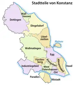 Konstanz is subdivided into 15 wards or districts (Stadtteile):