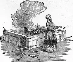 The term korban primarily refers to sacrificial offerings given by humans to God to show homage, win favor, or secure pardon.[1] The object sacrificed was usually an animal that was ritually slaughtered and then transferred from the human to the divine realm by being burned upon an altar.[2][3][4] Other sacrifices included grain offerings, which were made from flour and oil instead of meat.[5]
