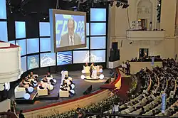 Another key issue was the 2004 Summer Olympics scheduled to be held in Athens in the first year of his government: several key buildings were unfinished at the time of the election, the security budget had increased to €970 million and authorities announced that a roof would no longer be constructed over the main swimming venue. The main Olympic Stadium, the designated facility for the opening and closing ceremonies, was completed only two months before the games opened, with the sliding over of a futuristic glass roof designed by Spanish architect Santiago Calatrava. Other facilities, such as the streetcar line linking the city and the airport were largely unfinished just two months before the games. The subsequent pace of preparation, however, made the rush to finish the Athens venues one of the tightest in Olympics history and everything was finished just in time for the Opening Ceremony. At the end, the Games were held exactly as planned and were globally hailed as a spectacular success. Nonetheless and as a result of the delays, large cost overruns resulted in a deficit in the national accounts above EU stipulations.[3] The ND government and the previous government of Costas Simitis criticized each other for the messy preparations. PASOK criticized the New Democracy government for using the Olympics as a pretext to renege on promises. Under the weight of the huge costs (estimated at €7bn), the deficit shot up to 5.3%. Karamanlis declared that "Social policy was done with borrowed cash, military spending did not show up on the budget, debts were created in secret".[4]