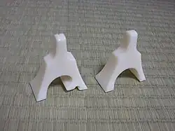 The bridges (ji) used to be made of ivory, but nowadays are typically made of plastic, and occasionally made of wood. One can alter the pitch of a string by manipulating or moving the bridge.[16] For some very low notes, there are small bridges made, as well as specialty bridges with three different heights, depending on the need of the tuning. When a small bridge is unavailable for some very low notes, some players may, as an emergency measure, use a bridge upside down, though this is unstable and not ideal. Bridges have been known to break during playing, and with some older instruments which have the surface where the bridges rest being worn due to much use, the bridges may fall during playing, especially when pressing strings. There are, of course, various sorts of patch materials sold to fill the holes which cause the legs of a bridge to rest on an unstable area. About 6 feet (1.8 m) long and 1 foot (0.30 m) wide, the koto is traditionally placed on the floor in front of the player, who kneels.[17]
