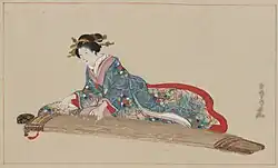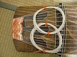 The koto (箏 or 琴) is a Japanese plucked half-tube zither instrument, and the national instrument of Japan. It is derived from the Chinese zheng and se, and similar to the Mongolian yatga, the Korean gayageum and ajaeng, the Vietnamese đàn tranh, the Sundanese kacapi and the Kazakh jetigen.[1] Koto are roughly 180 centimetres (6 ft) in length, and made from Paulownia wood (Paulownia tomentosa, known as kiri). The most common type uses 13 strings strung over movable bridges used for tuning, different pieces possibly requiring different tuning. Seventeen-string koto are also common, and act as bass in ensembles. Koto strings are generally plucked using three fingerpicks (tsume), worn on the first three fingers of the right hand.