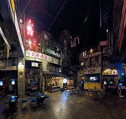 A partial recreation of Kowloon Walled City existed in the Warehouse Kawasaki, an amusement arcade that operated from 2009 to 2019 in the Japanese suburb of Kawasaki, Kanagawa. The atmosphere of the walled city was reflected in the arcade's narrow corridors, electrical wires, pipes, postboxes, sign boards, neon lights, frayed posters, and various other small touches.[95]