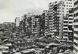 In January 1950, a fire broke out that destroyed over 2,500 huts, home to nearly 3,500 families and 17,000 total people.[13] The disaster highlighted the need for proper fire prevention in the largely wooden-built squatter areas, complicated by the lack of political ties with the colonial and Chinese governments.[14] The ruins gave new arrivals to the walled city the opportunity to build anew, causing speculation that the fire may have been intentionally set.[14][15]