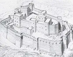 "Krak" is derived from karak, the Syriac word for a walled city or fortress.[3] Before the arrival of the crusaders, the local Arab ruler had established a fortification on the site manned by Kurds, giving it the name, in Arabic, of Ḥoṣn al-Akrād (حصن الأكراد), or "fort of the Kurds".[4] Following the construction of the present castle, the crusaders (whose elite spoke either Old French or, in Tripoli, possibly Old Occitan[5]) corrupted that name into Le Crat and then, as a result of confusing it with karak, the name evolved into Le Crac.[6]