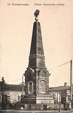 The city originated in 1793 as a military camp, then as a fortress built by the Black Sea Cossacks to defend imperial borders and to assert Russian dominion over Circassia, a claim which Ottoman Turkey contested. In the first half of the 19th century, Yekaterinodar grew into a busy center of the Kuban Cossacks, gaining official town status in 1867.[21] By 1888, about 45,000 people lived in the city, which had become a vital trade center for southern Russia. In 1897 an obelisk commemorating the two-hundred-year history of the Kuban Cossacks (seen as founded in 1696) was erected in Yekaterinodar. The city was the administrative center of the Yekaterinodarsky Otdel of the Kuban Oblast.