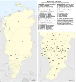 Krasnoyarsk Krai consists of forty-four districts and sixteen towns of district significance. Two of the districts (Evenkiysky and Taymyrsky; the former autonomous okrugs) have special status.