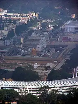 Tirumala Temple and Vaikuntam Queue Complex (semicircular building in the foreground) as seen from Srivari Padalu on Narayanagiri hill